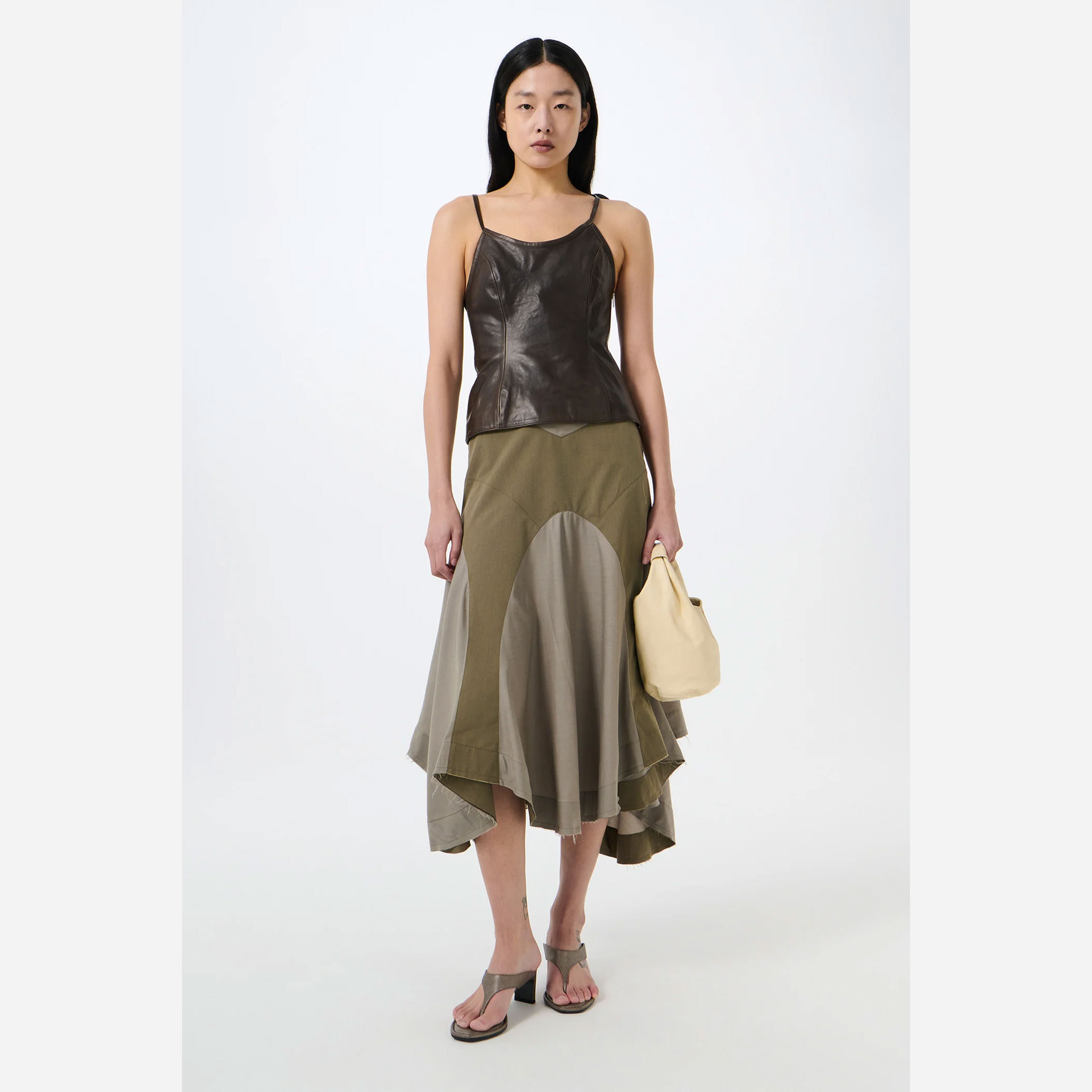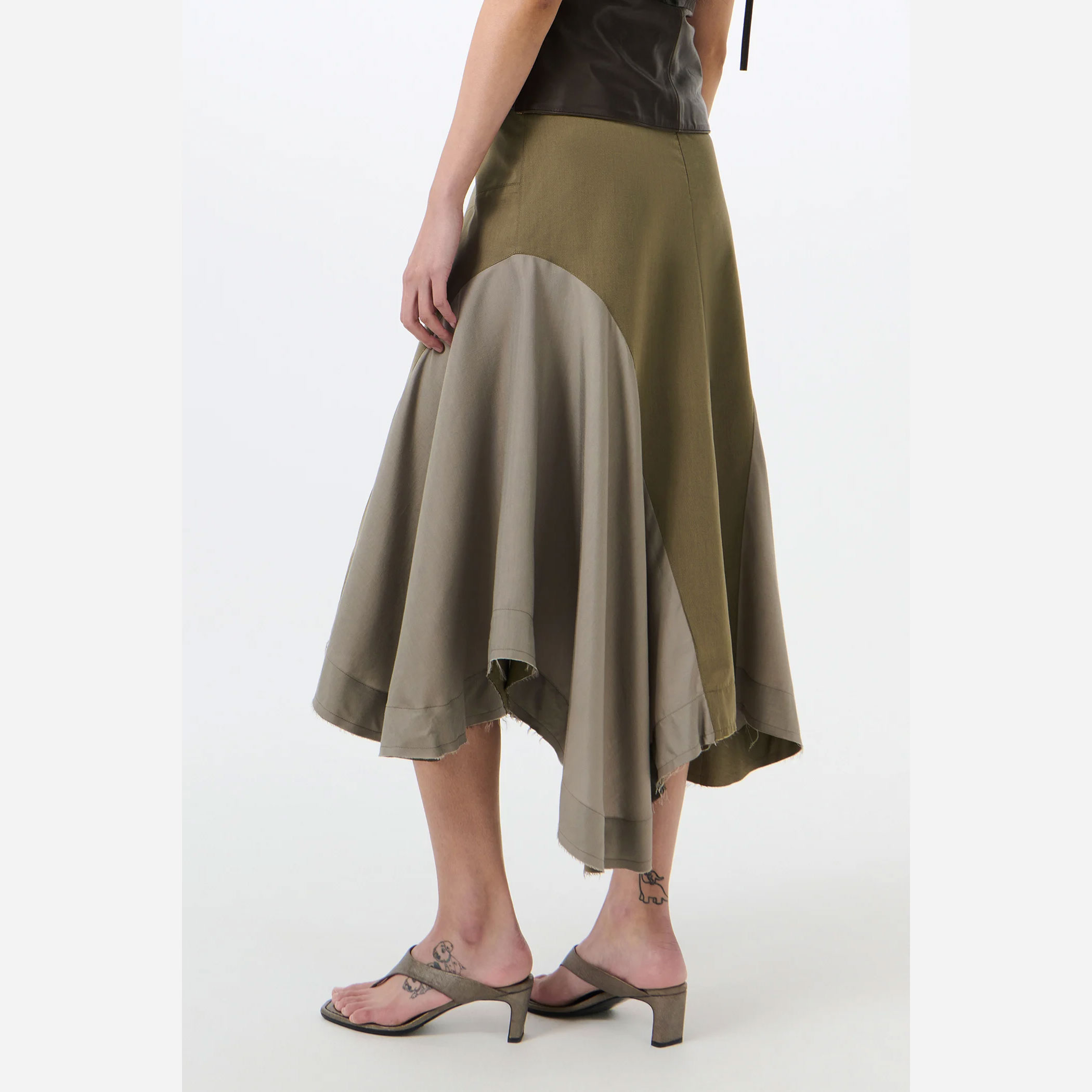 背面には隠しファスナーとフック&アイ留めを配し、すっきりとした仕上がりに。切りっぱなしの裾がラフなニュアンスを添えつつ、ウエスト内側にはウェビングで補強されたバンドを施し、伸びを防ぎながら安定したフィット感を実現しています。