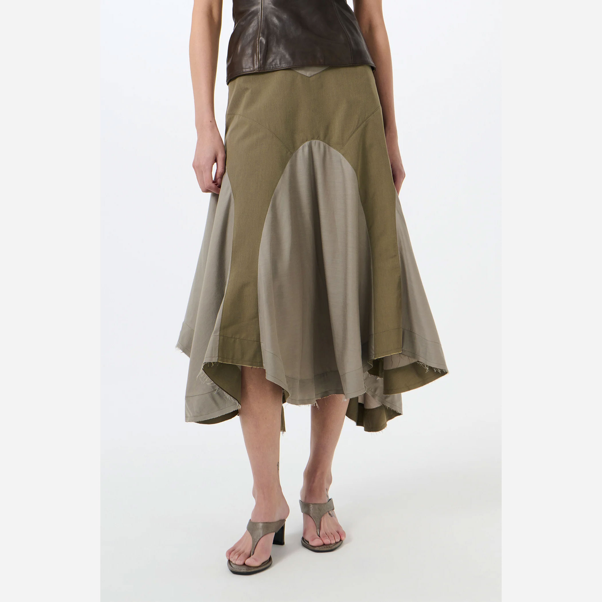 ヒップに沿うフィット感のあるシルエットに、裾のフリルが軽やかな動きをプラス。さらに、大きなシースルーのドレープパネルを用いたコントラストデザインが、奥行きのある表情とモダンな印象を演出します。