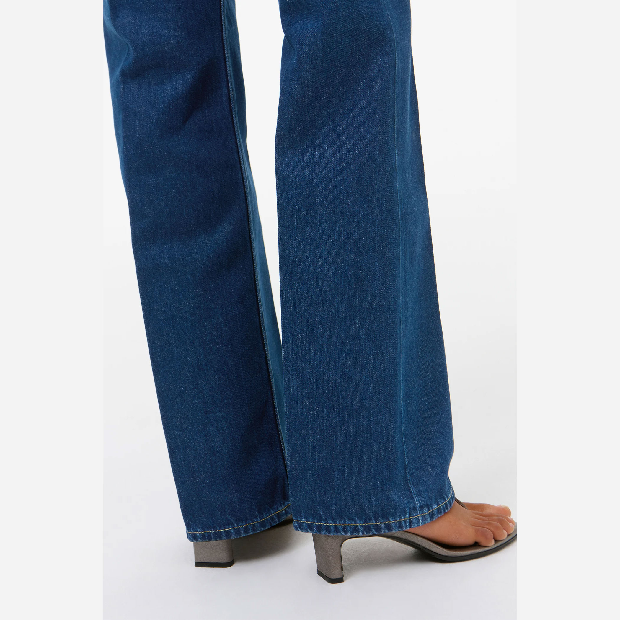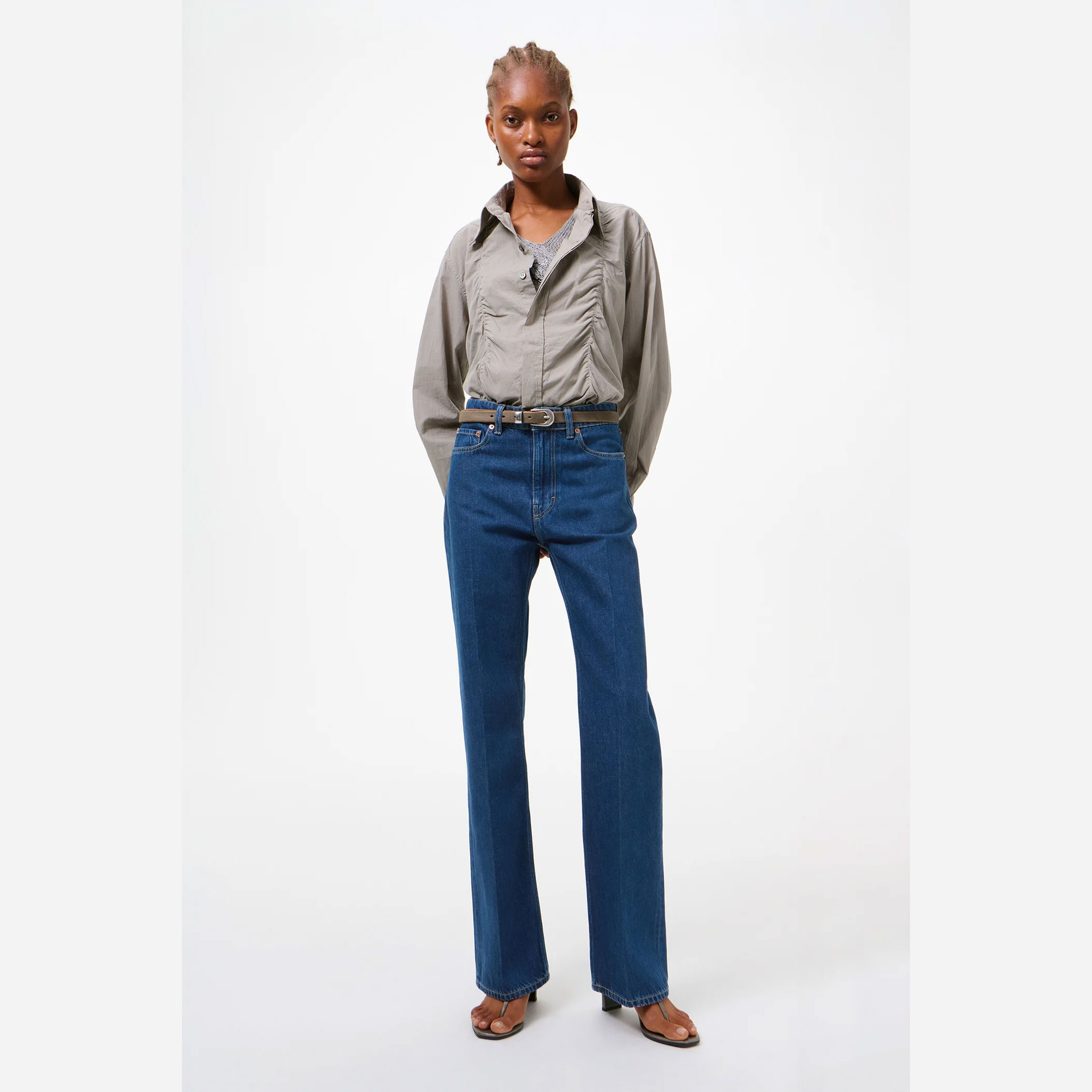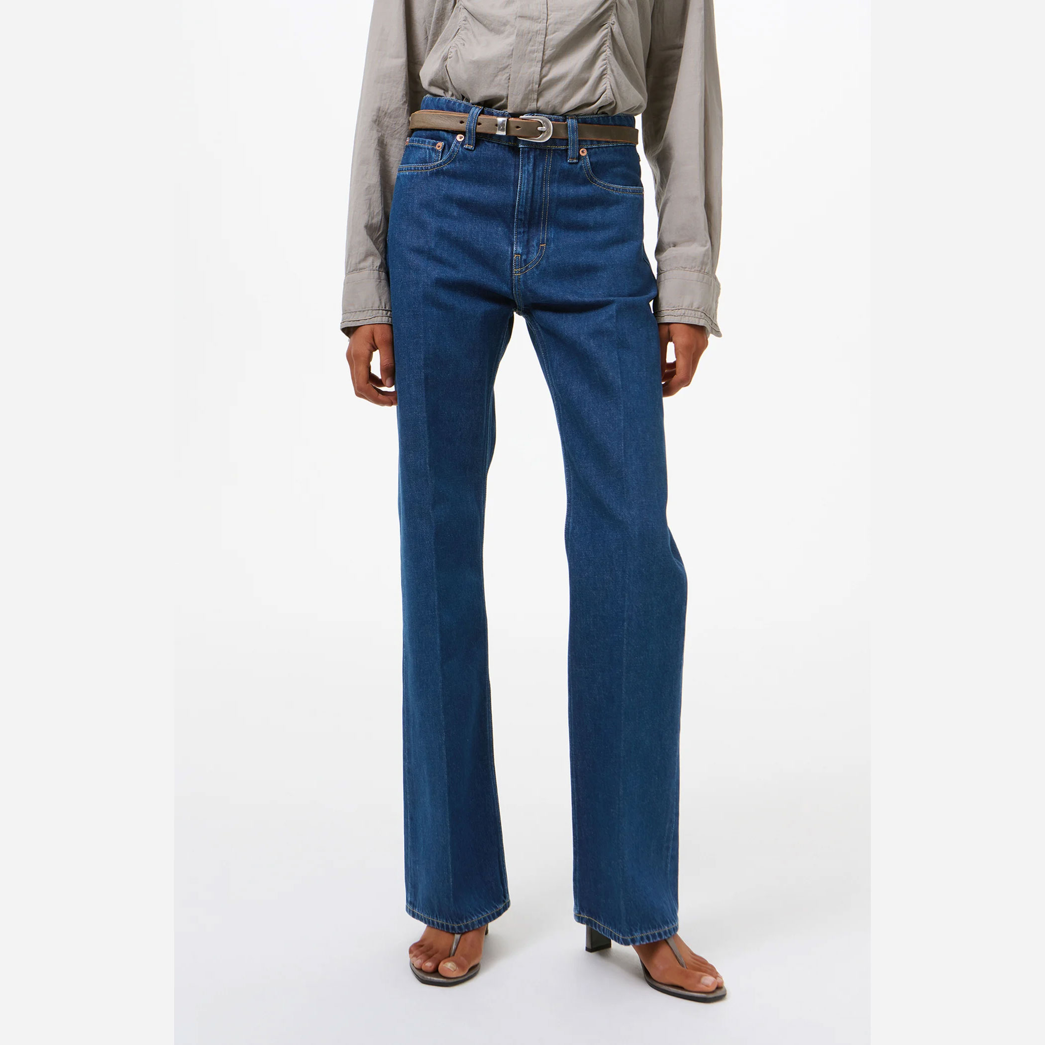 ミッドウエスト設計に、ストレートなラインから緩やかに広がるブーツカットの脚部が、美しいバランスを演出。プレス加工による折り目がシャープな印象を加え、カジュアルでありながら上品な佇まいに仕上げています。5ポケット仕様やジップフライなど、実用性にも配慮し、「Our Legacy」のラバーパッチがさりげないアクセントとなっています。
