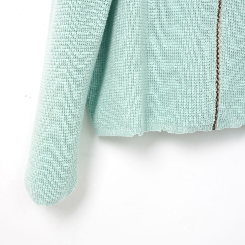爽やかなミントカラーが印象的で、春夏シーズンの軽やかなスタイリングに心地よいアクセントを添えます。フロントにはジップ仕様を採用しており、開閉によってスタイリングの幅を広げられるのも魅力のひとつ。