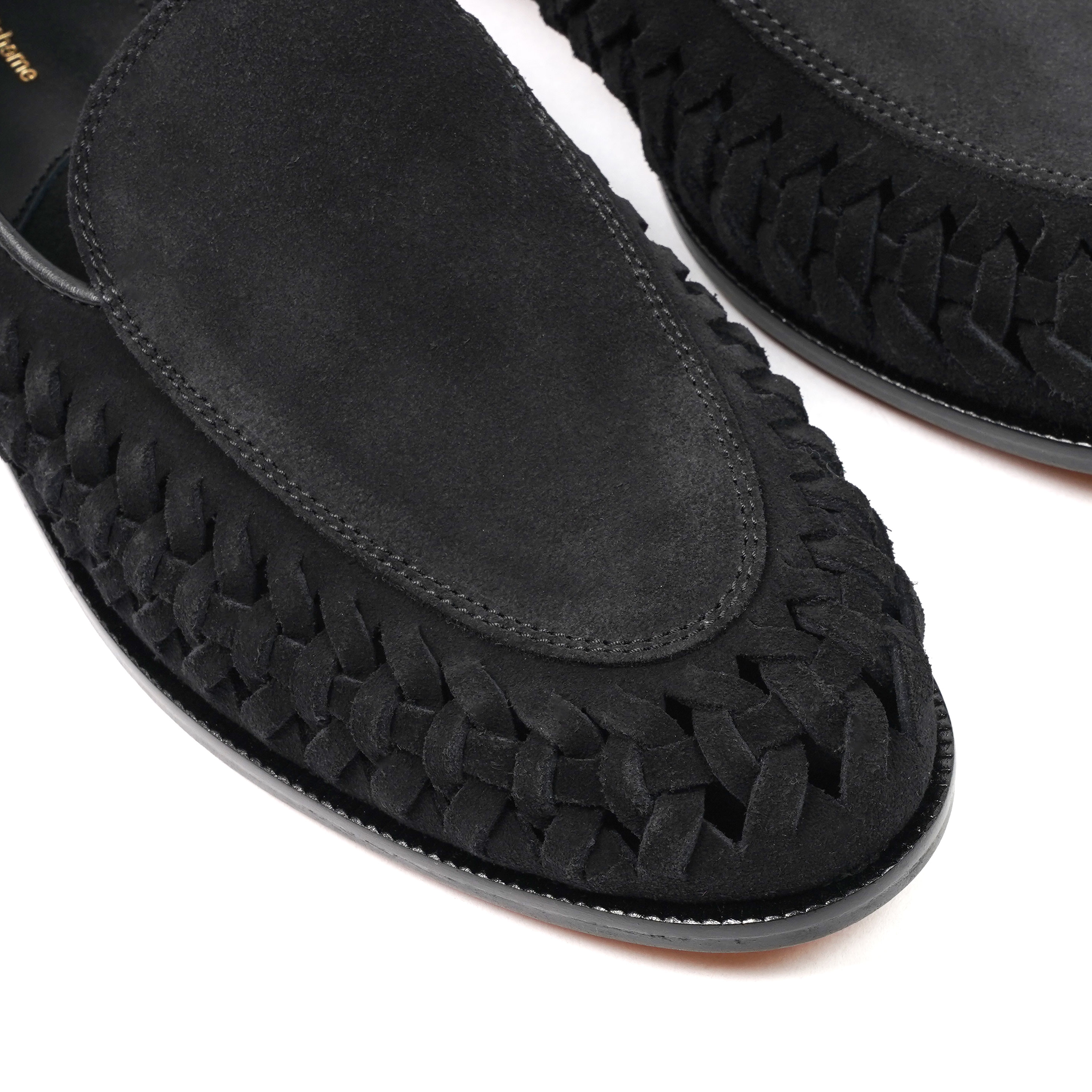レザーレースを編み込むことでメッシュ状のディテールを形成したスウェードローファー。一枚革の柔らかな質感と、足を包み込むような軽やかな履き心地。スリット部分からさりげなく足元が覗くことで、ソックスや素足などスタイリングによって異なる表情を楽しめます。製法はドレッシーな仕立てをベースにしながら、抜け感のあるデザインとのバランスが◎。レザーソールによる上品さと、スリッポンならではの軽快さを兼ね備えた一足です。素材には天然皮革を使用しているため、色味や風合いには個体差があり、履き込むほどに表情が深まる経年変化も魅力のひとつ。